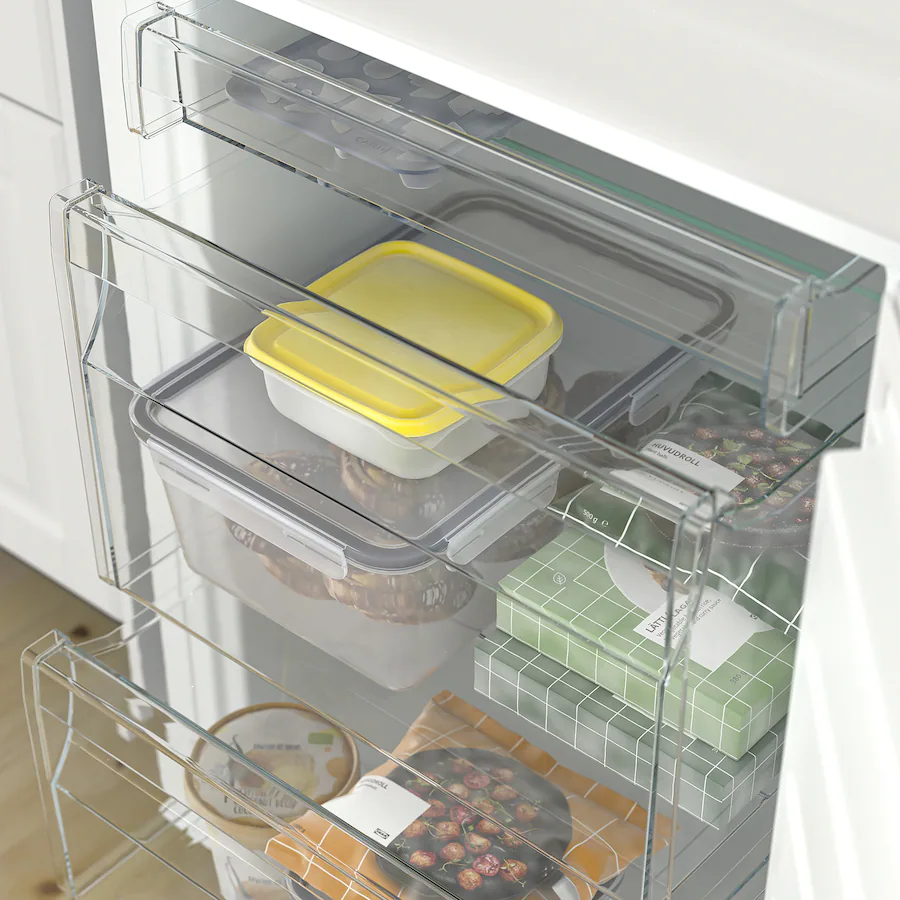 De IKEA Tinad beschikt over een totaal inhoudsvolume van circa 270 liter, waarvan ongeveer 200 liter voor het koelgedeelte en 70 liter voor de vriezer. Het apparaat is uitgerust met automatische ontdooifunctie in het koelgedeelte, verstelbare glazen legplanken en LED-binnenverlichting voor helder zicht op alle niveaus.